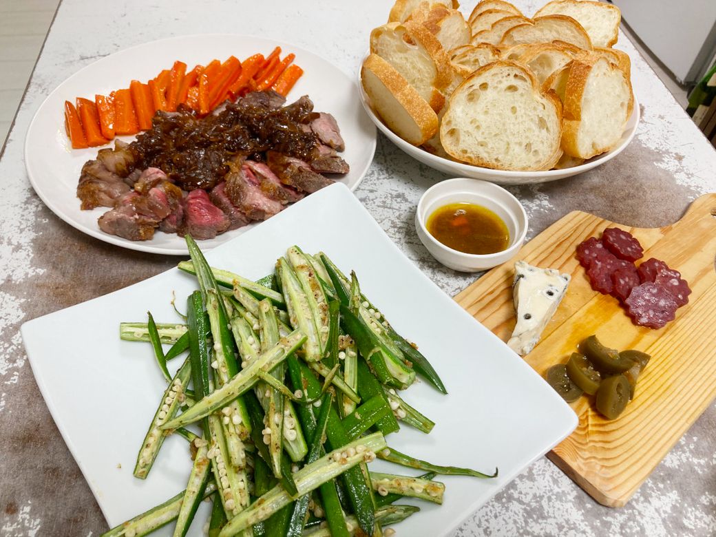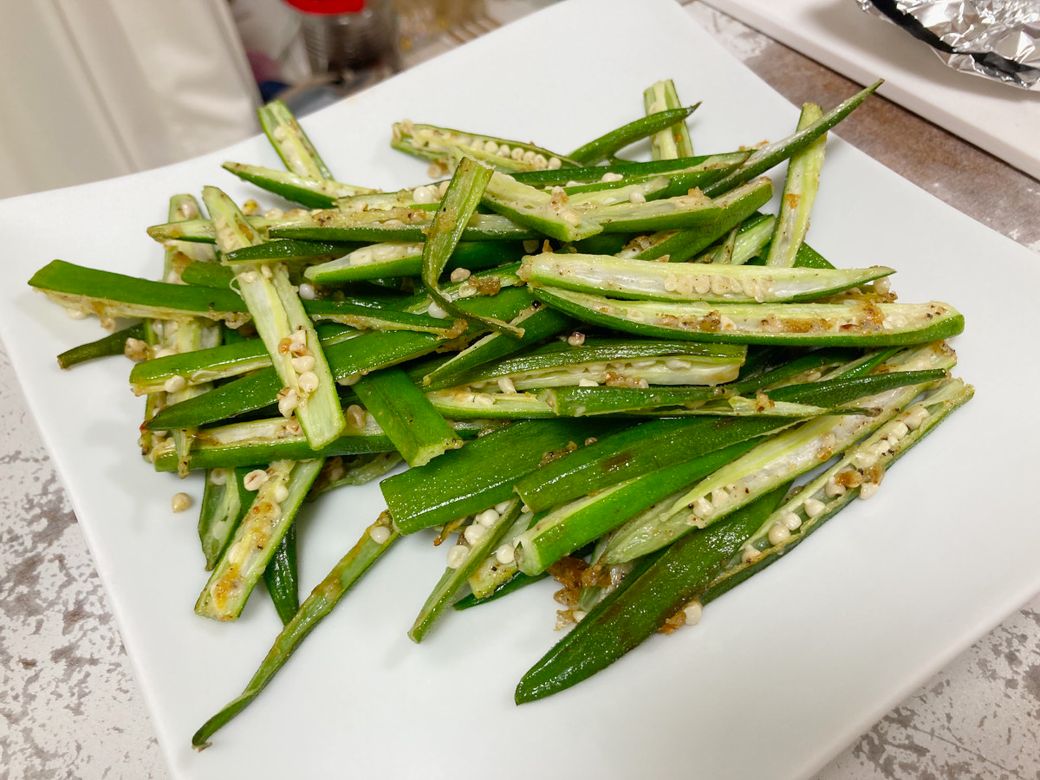 見切り品で大袋だったオクラは、縦に切って焼きました。サクサク食べられるので、おつまみにも良いです。
