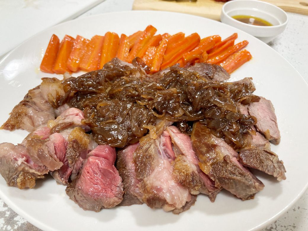 付け合わせはにんじんグラッセ。奥にあるソースはグラッセを作ったときに出たもので、甘いにんじん風味のバターソースです。パンにつけると、とってもおいしい。