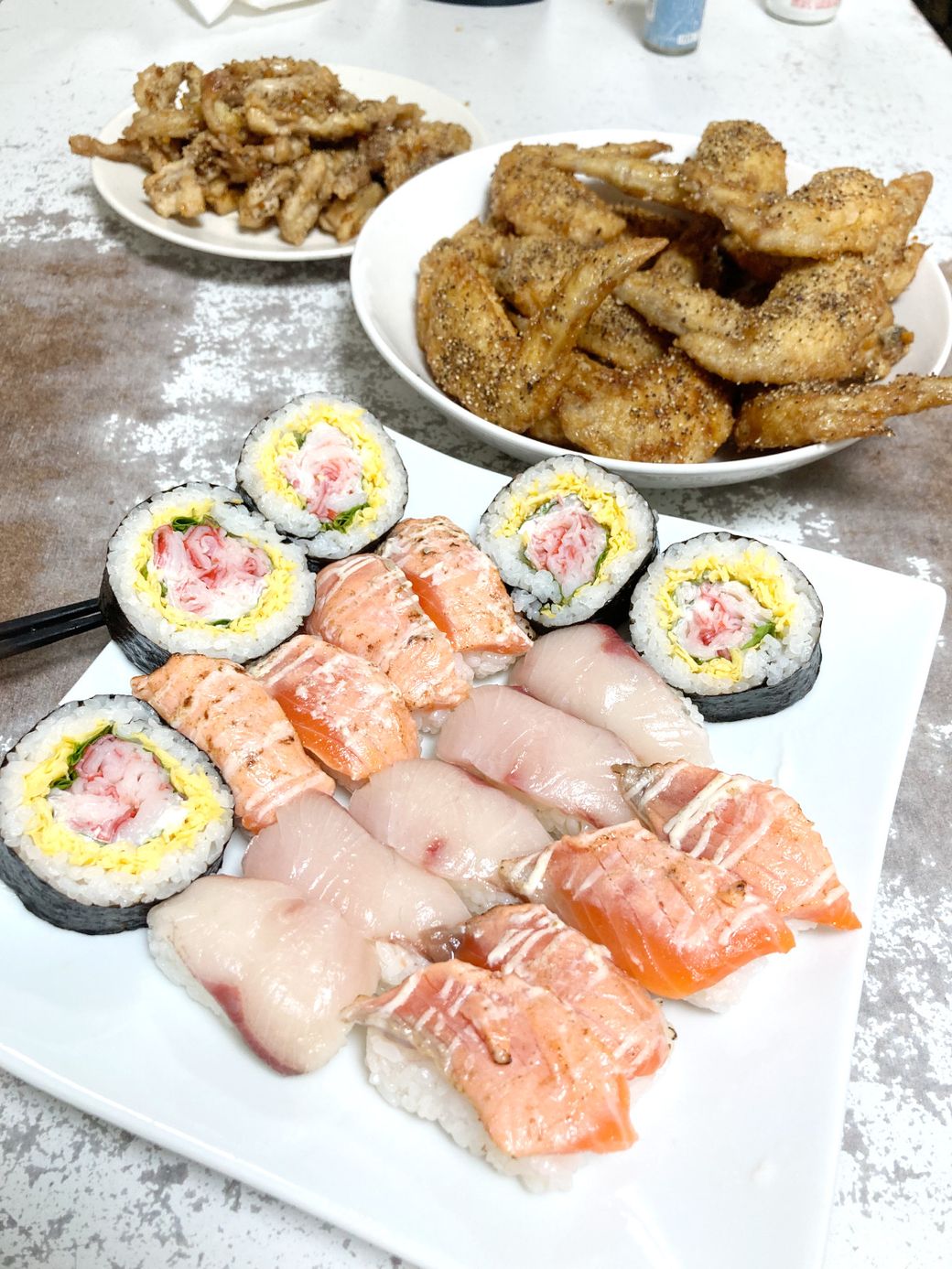 今回は「お寿司とジェネリック山ちゃん(鶏の揚げ物)」です。