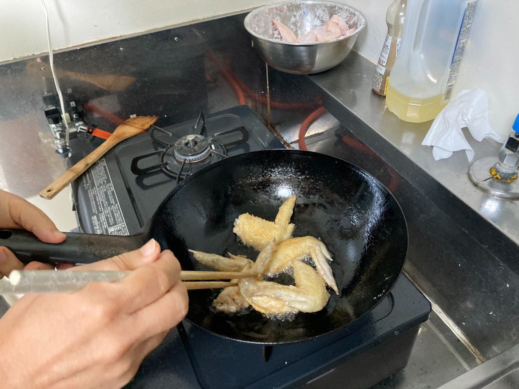 では炒めてるように見えますよね。 中華鍋使って、手羽先が5本くらい着かる程度の油で十分です。 先の細い方は油から出てて構いません。 鍋をゆすって時々油かけてやるくらいがいいバランスです。