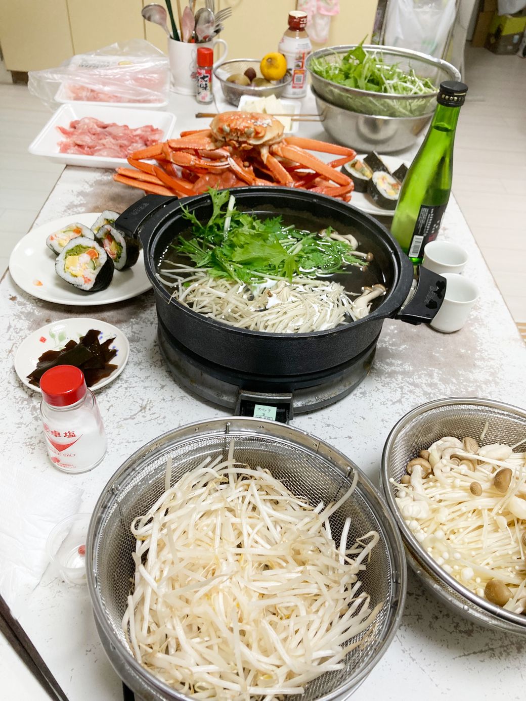 豚肉のお鍋と、いつもの半額お寿司、そしてカニ🦀✨です。