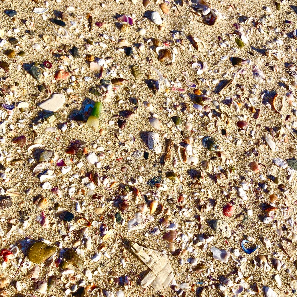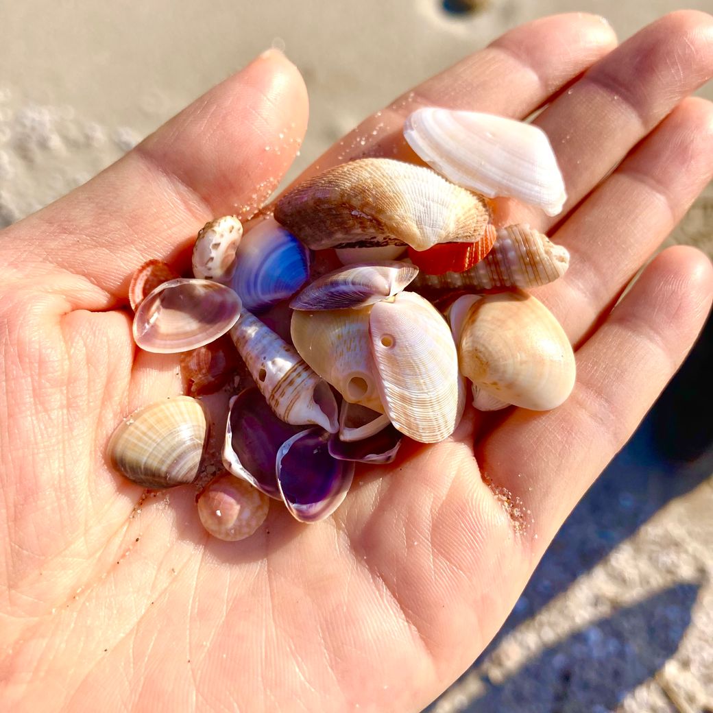波が引いた後に残った貝殻。宝探しの気持ちで、夢中になってかわいい貝殻を拾いました。