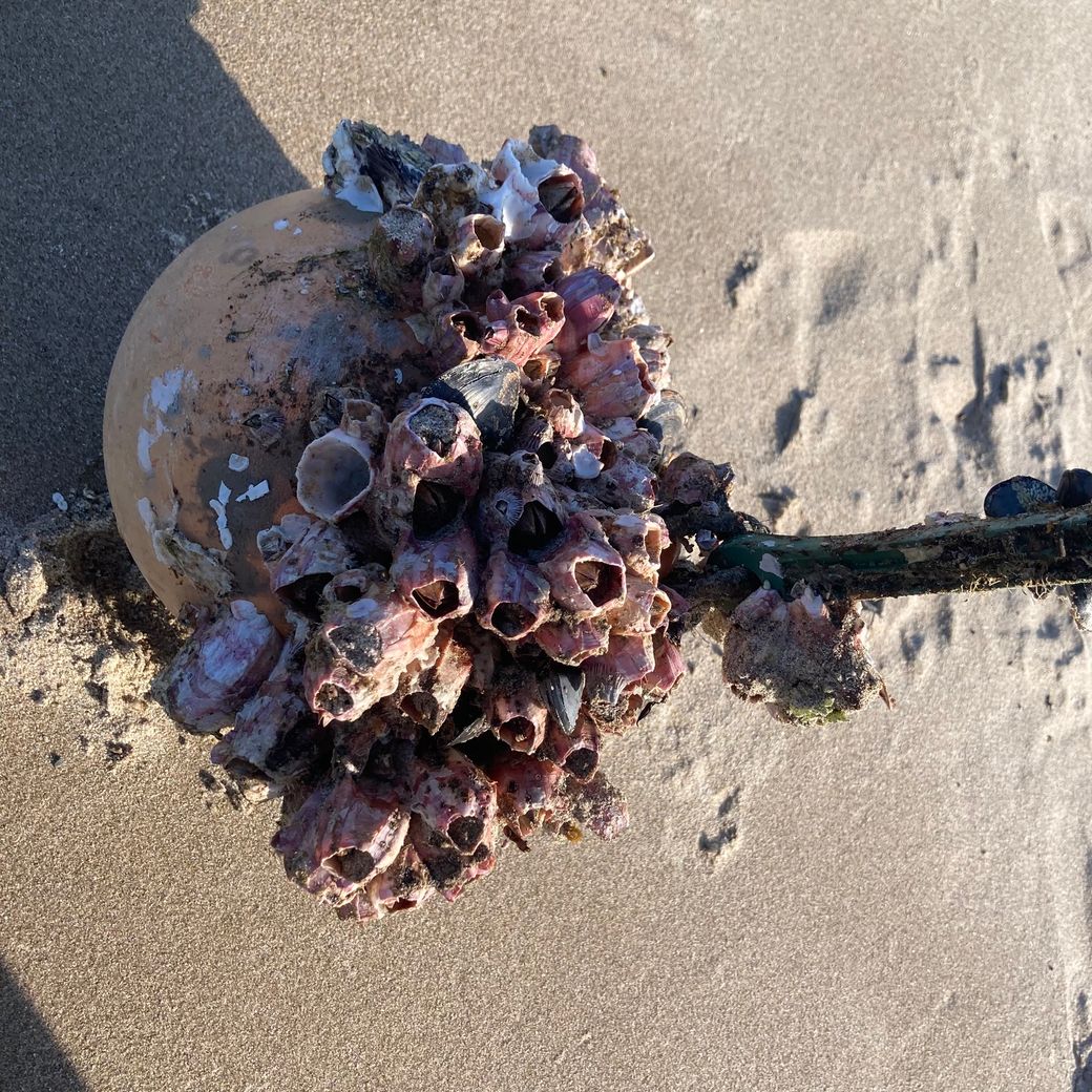 しばらく歩くと、不時着したボールを見つけました。表面にはフジツボがびっしりついています。しかも、よく見るとまだ生きてる…