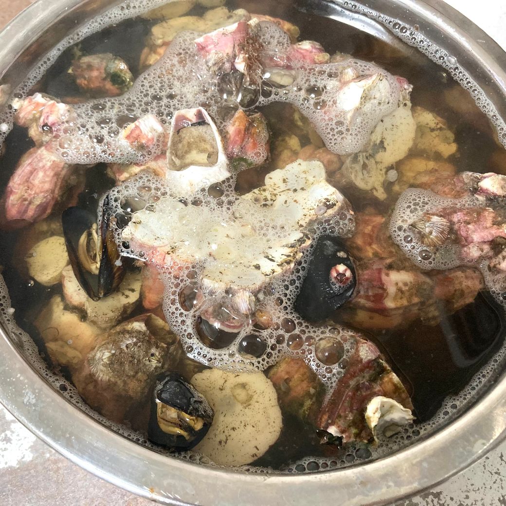 茹でます。フジツボ以外に小さなムール貝が少しだけありますね。