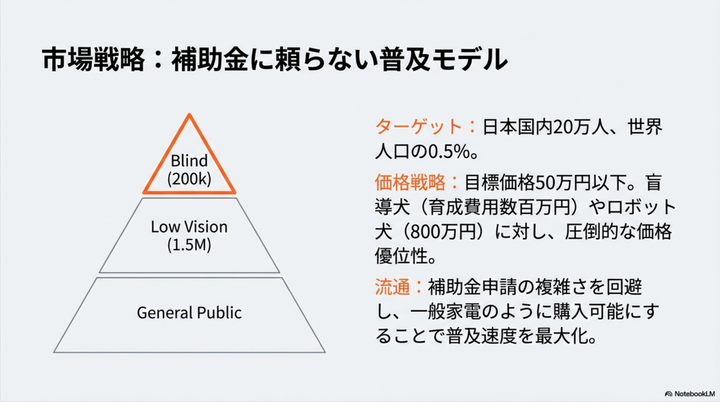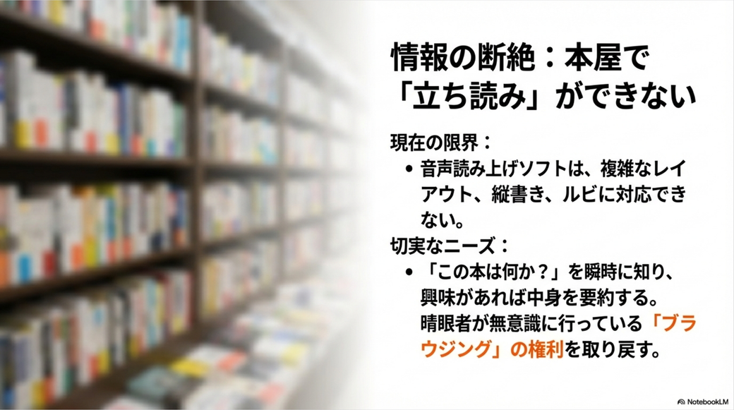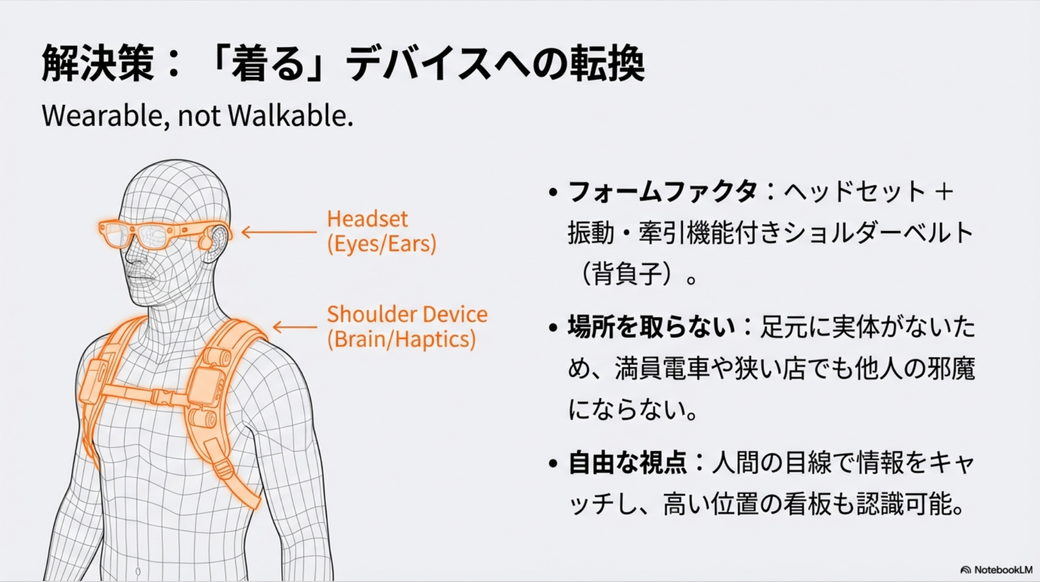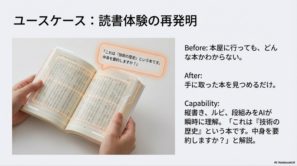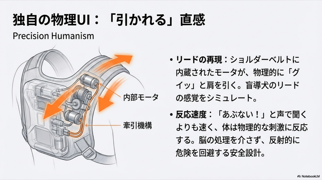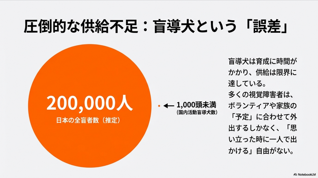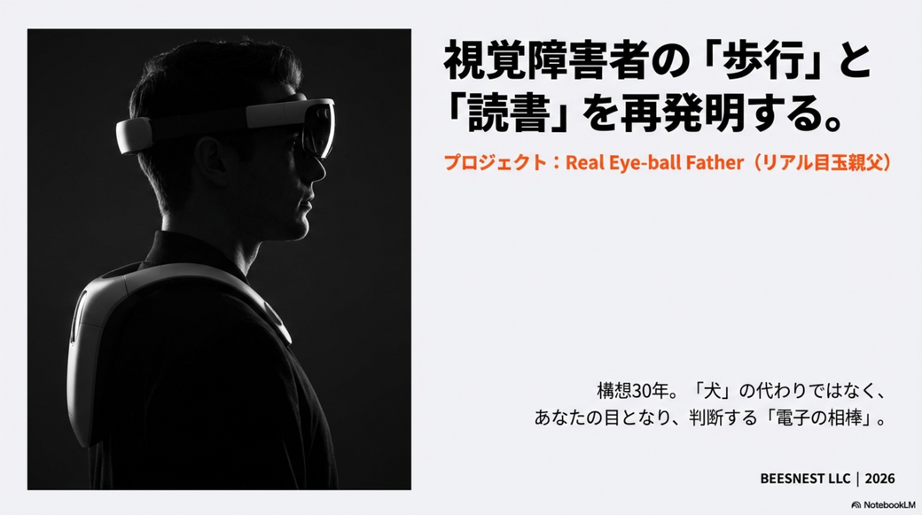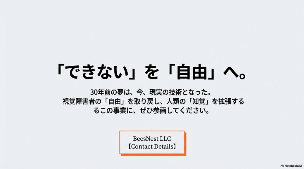 一連の話をAIモードと会話をしていていい感じになったので、NotebookLMを使ってプレゼン資料を作ってみました。 多少つっこみどころもありますし、その表現どうよ? な箇所(盲導犬が「誤差」とか酷いですね)もありますが、まぁまぁ言いたいことは書いてあるかなと思います。
