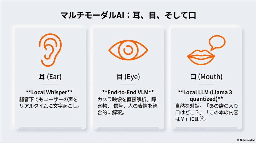 あたりかなと思います。 これらは既に色々なものが存在していますね。 特にLLMやVLMはスマホ対応のこともあって、スタンドアロンでも動く軽量なものが随分増えました。