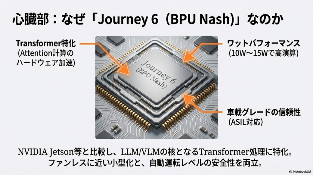 これはHorizon Roboticsが作っている車載用SoCシリーズの「Journey6」ファミリのものです。 NPUにはBPU Nashというものが使われているのですが、これはスマホ用SoCにありがちのDNN専用ではなくて、Transformerに対応したNPUです。 RK3588のNPUがLLMとかから見るととても期待外れだったので、こいつのNPUも同類かとばかり思っていたのですが、逆の意味で期待外れです。