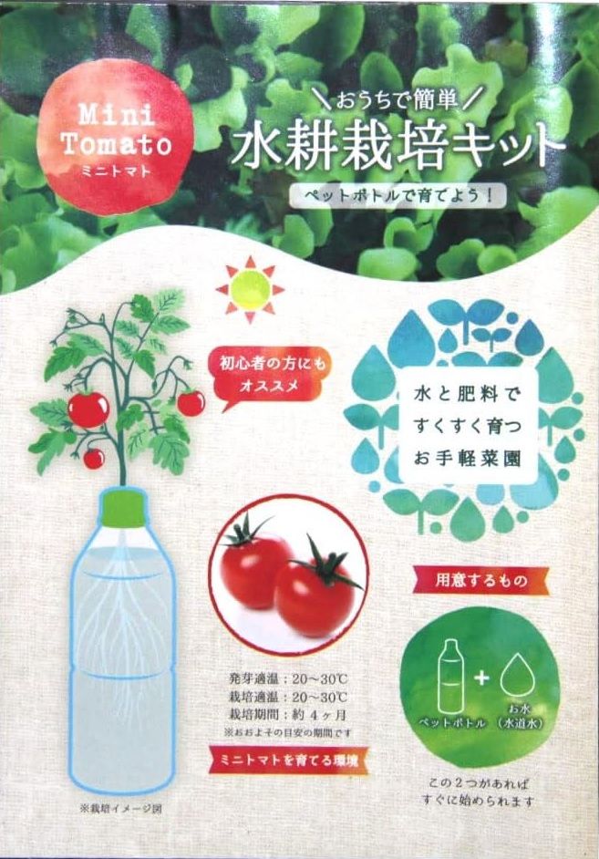「ミニヒメ」は矮性ミニトマトと言われる品種の一つで、そもそも矮性ミニトマトは観賞用ということにされている小型種なのですが、その中では甘い実をつけるものだそうで。矮性ミニトマトはしばしば「ペットボトルで水耕栽培」みたいなキット